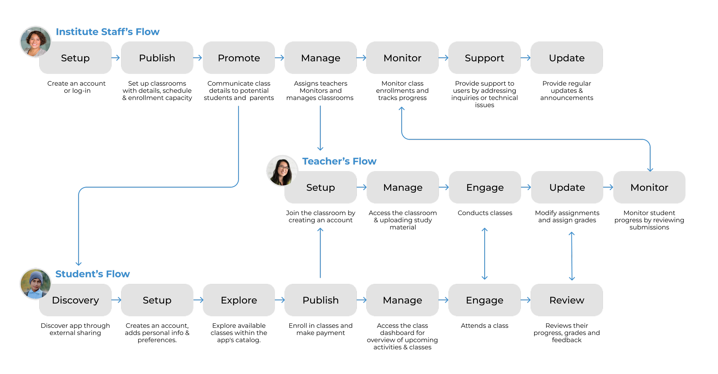 To deliver a comprehensive and seamless experience, we identified an end-to-end product flow that empowers users to achieve their goals, from institute staff creating classrooms to students successfully engaging with teachers.