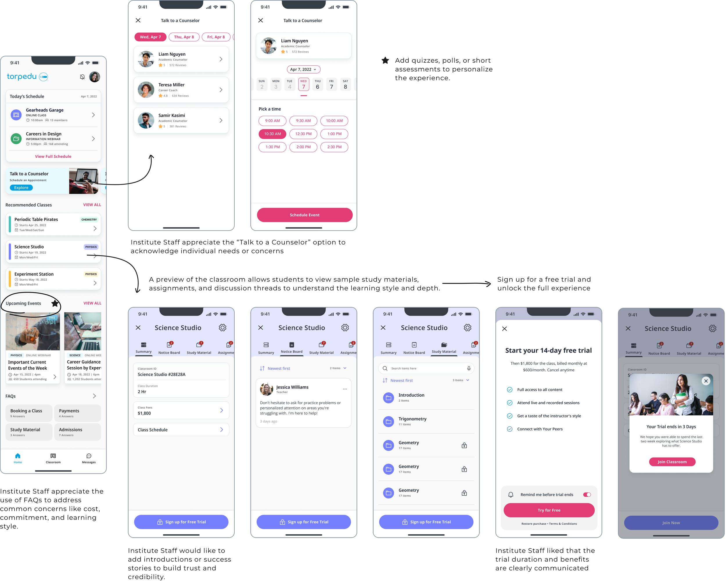 The enrollment process is pivotal for the Institute staff in turning hesitant potential students into engaged learners. User testing helped us evaluate the effectiveness of personalized course recommendations and trial classes in enticing students to enroll in a classroom.